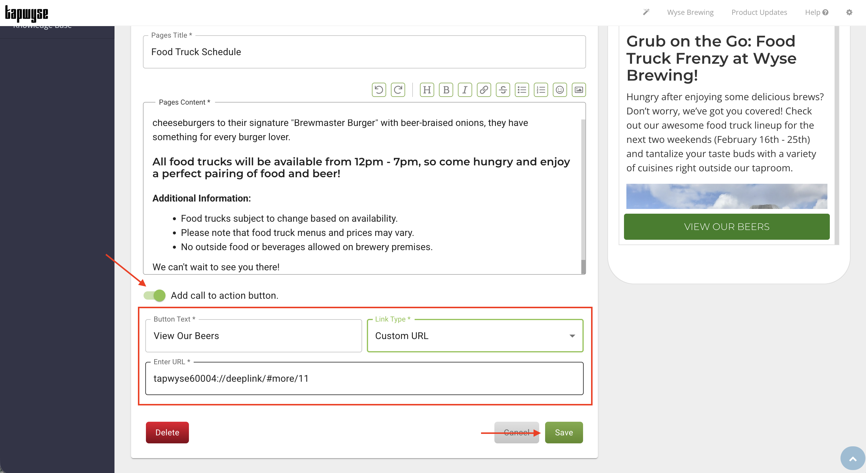 Call To Action - you have the choice to add a Call To Action button at the bottom of the Page that can take your app users out of the Page to a different end point (ex. website, ticketing site, button within the app, etc.)