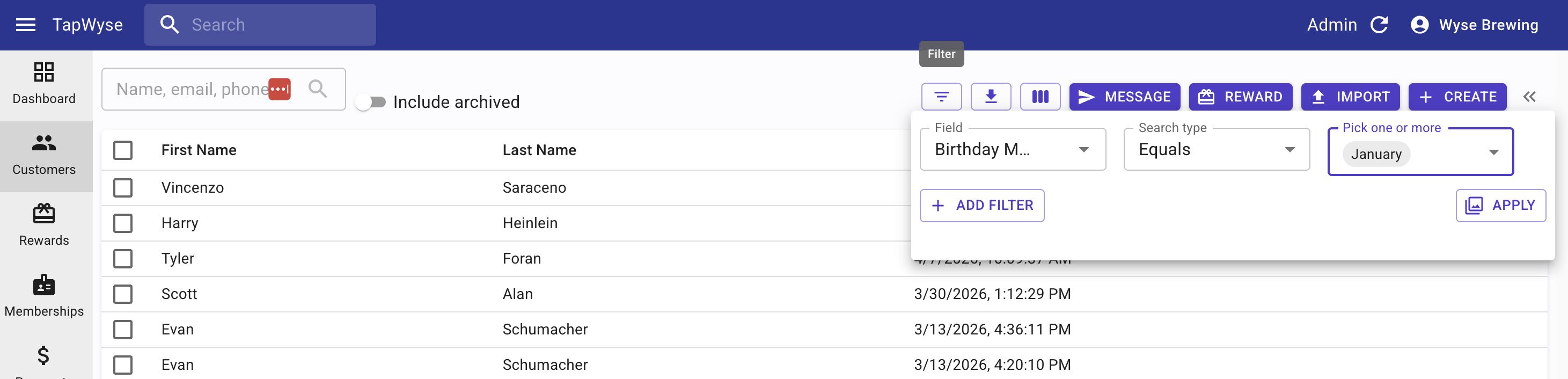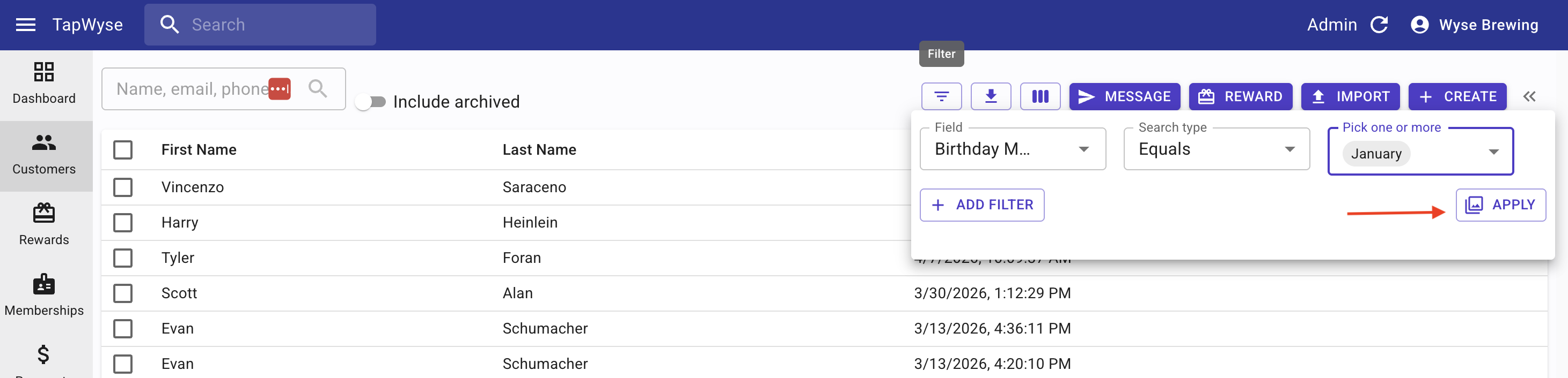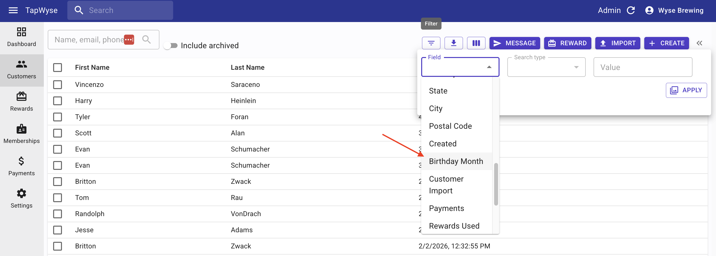 - The Field dropdown is where you choose the Filter (ex. Birthday Month) - this specific Filter would be used if you wanted to Filter your Customers list for a birthday month and only see the Customers who's birthday it is for the month you are Filtering for (ex. January).