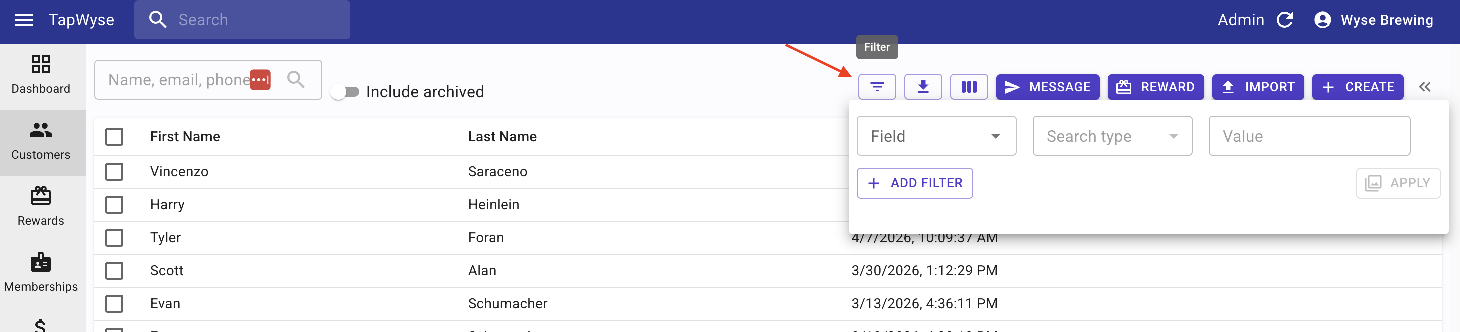 - To Filter your Customers list click the Filter icon, then you can choose how you want to Filter your list
