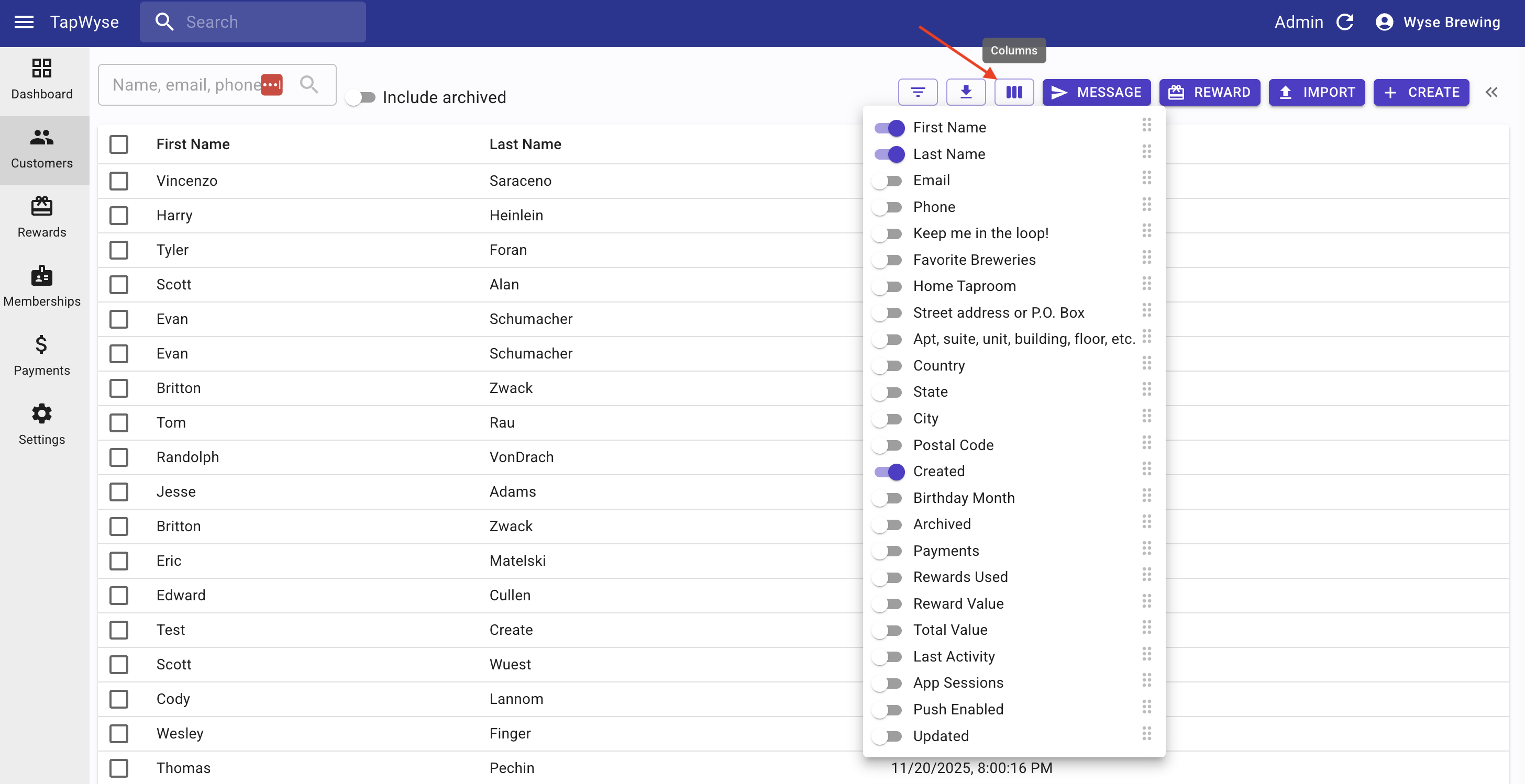 - To turn Columns on and off you will click the Columns icon. Next, choose the column(s) you want too see by turning that toggle to the on position (toggle to the right). If there is column you don't want to see, turn that toggle off (toggle to the left).