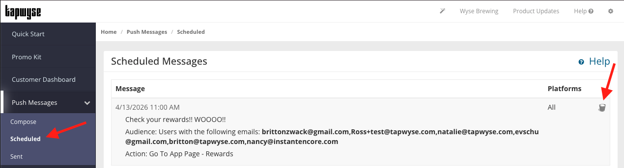 *If you need to delete a Scheduled Push Message simply click the trash can to the right of the message.