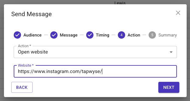 - Open website: You can add a URL so when the app user taps on the Push Message on the Lock Screen of their device the message will direct them to the URL (ex. Facebook Post, Instagram Post, Ticketing Link, Event Link, etc.)