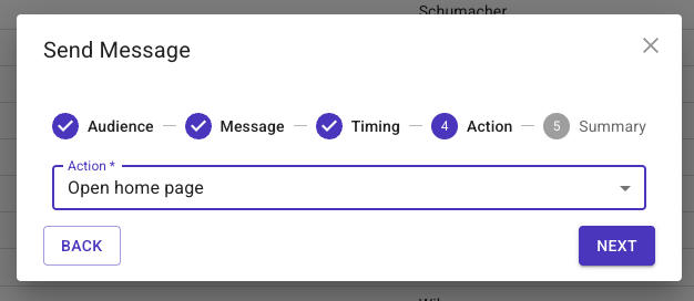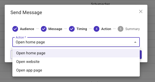 - Choose the Action of the Push Message by clicking the dropdown 'Action' field