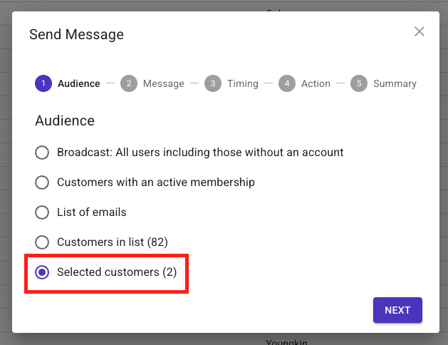 - After you choose the Customer Account(s), click the Message button (see above image) and choose 'Selected customers' as your Audience