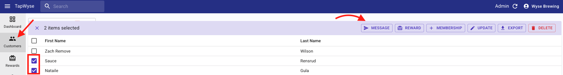- From the Customers tab in the Customer Dashboard you can choose certain accounts by clicking the box to the left of the individual Customer Account