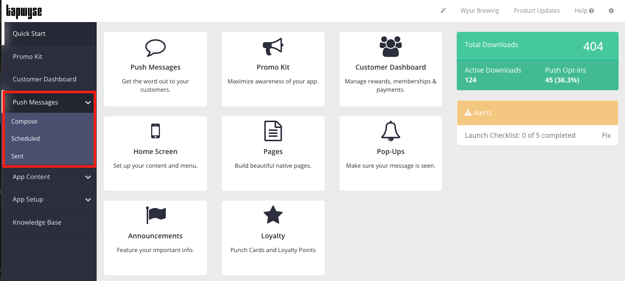 Push Message Analytics can be viewed under the Push Messages dropdown located on the left hand navigation bar of the App Manager Quick Start screen.